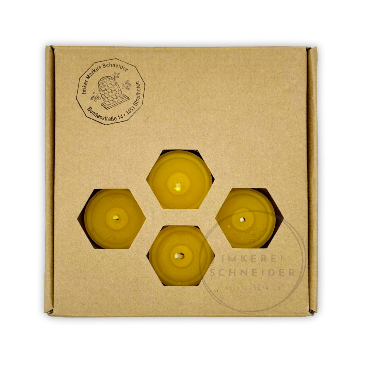9 Teelichter aus 100 % Bio-Bienenwachs im Geschenkkarton mit einem Teelichtglas.